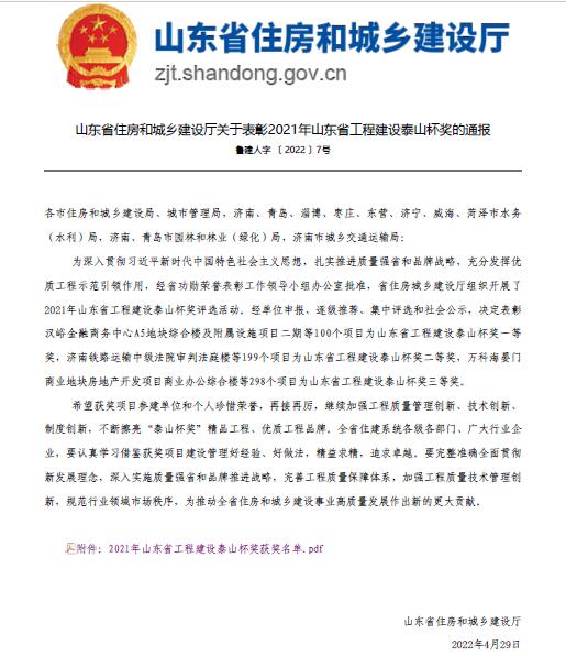 华体会平台两项工程荣获2021年度“山东省工程建设泰山杯奖”