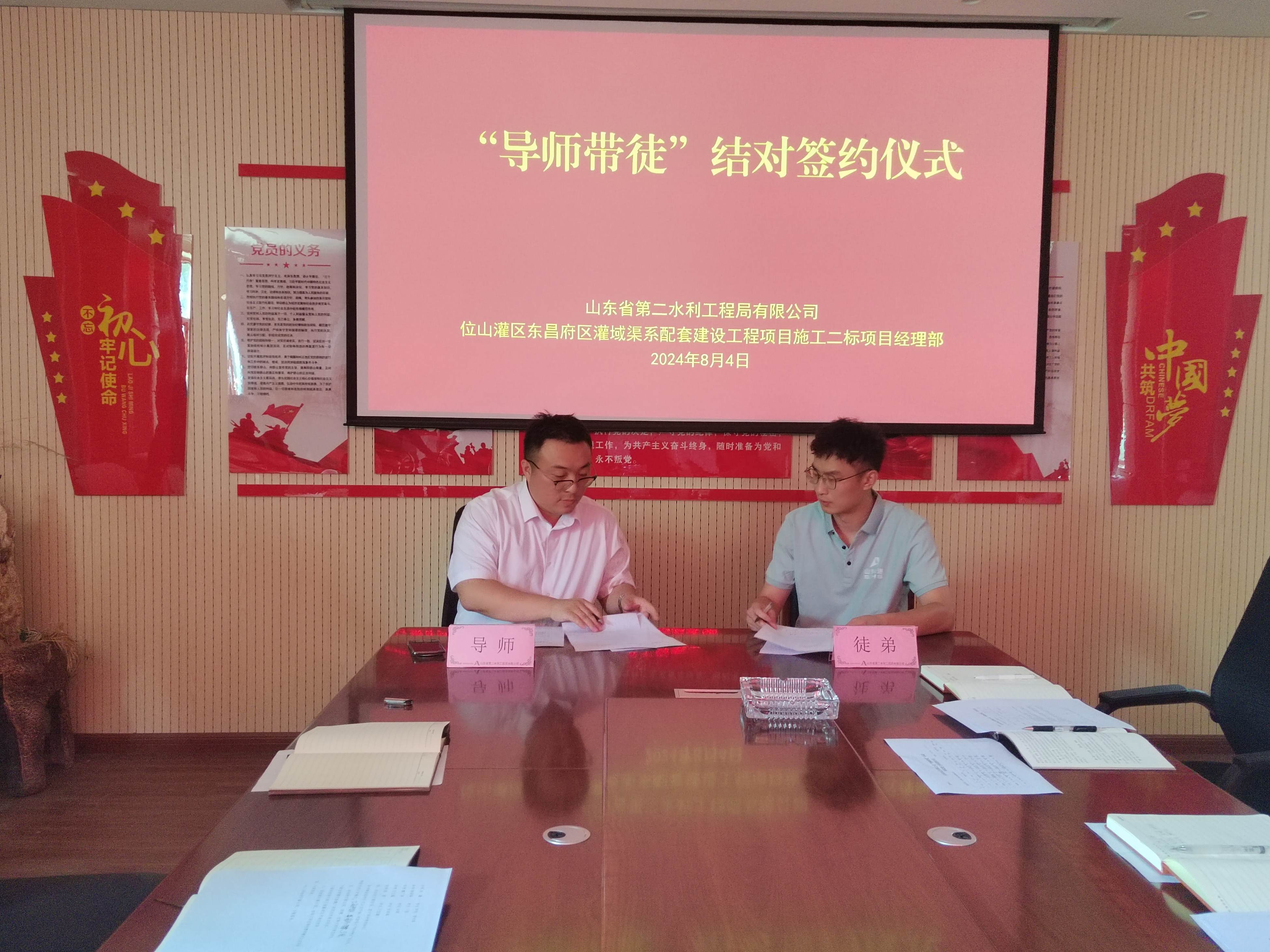 近日,二局有限华体会平台位山灌区东昌府区灌域渠系配套建设工程项目施工2标项目经理部举行了“导师带徒”结对签约仪式。