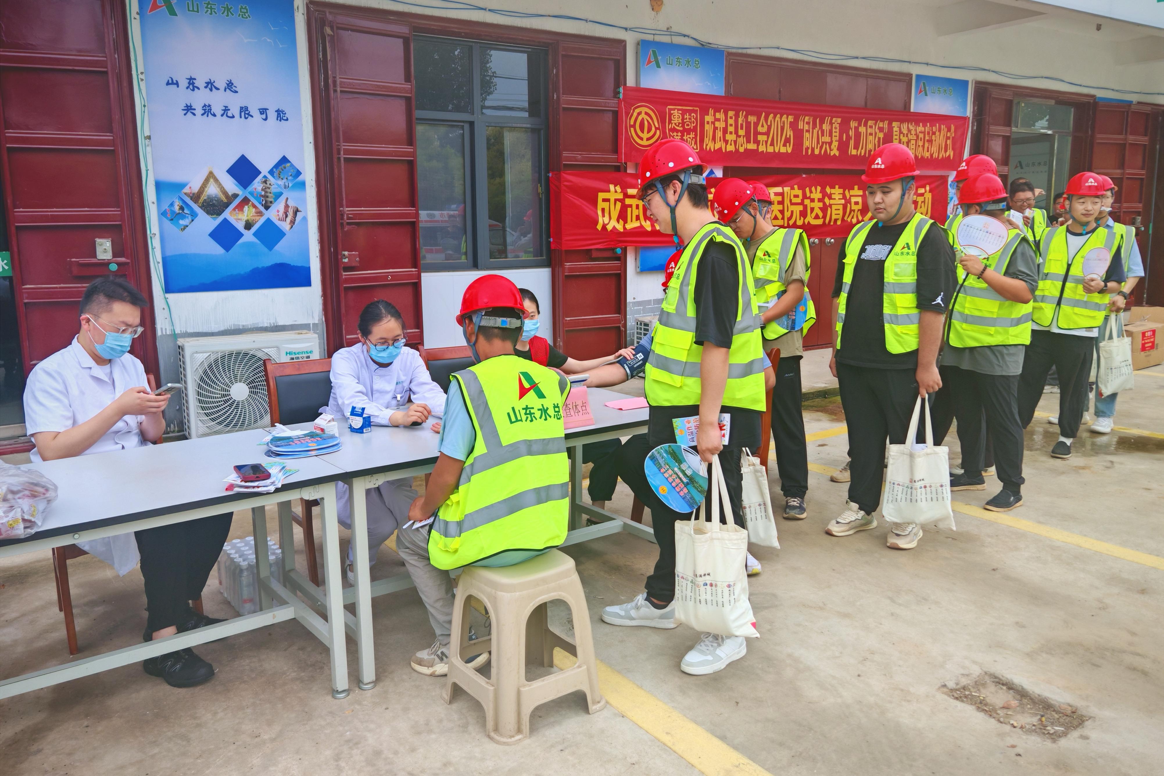 7月23日,菏泽市成武县总工会、成武县公立中医医院一行赴基础有限华体会平台成武县引调水工程项目部,开展“同心共夏 汇力同行”夏送清凉活动,慰问高温下奋战的一线工作人员。
